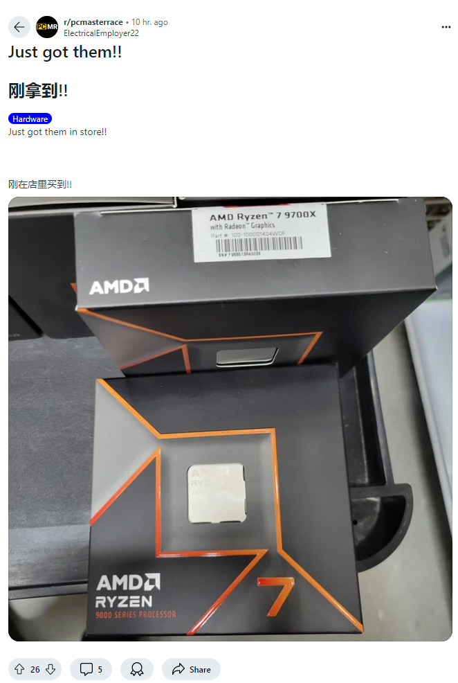近日,一位名为@ElectricalEmployer22的用户在论坛上发布了一则帖子,声称自己已经在经销商处购买到了尚未正式上市的AMD R7 9700X处理器。这款处理器采用了全新的Zen 5架构,并且需要购买新的AM5主板。目前来看,所有AM5主板都能够支持这款处理器(前提是已经获得了相应的BIOS更新),主流厂商的600系列主板基本都已经完成了适配。