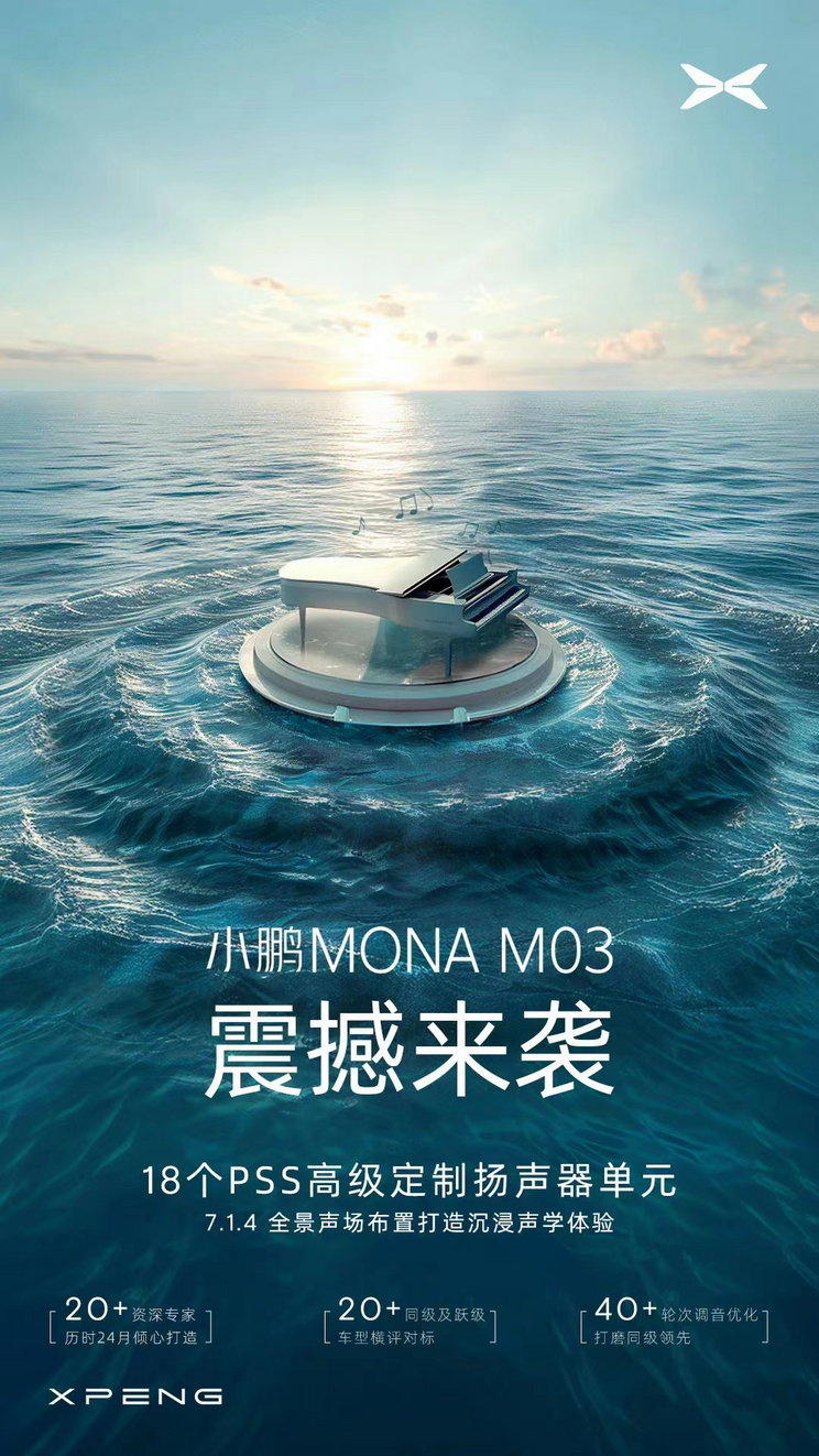 7月8日,小鹏MONA M03发布了其车辆音响系统配置。新车配备了18个PSS定制扬声器单元,并通过7.1.4全景声场布置打造了独特的声学体验。据官方介绍,该音响系统经过24个月的开发和40多次的调整优化。