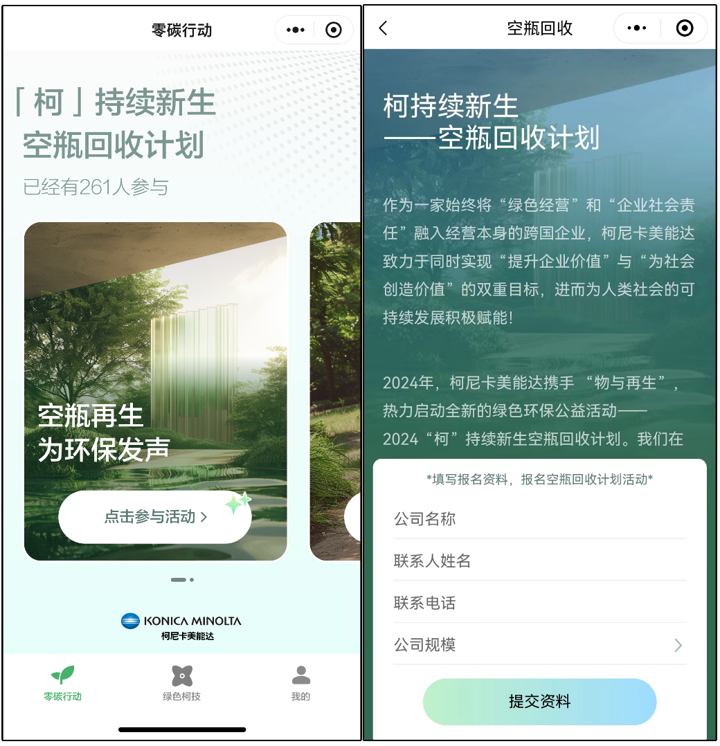 在新上线的小程序中,柯尼卡美能达中国精心设立了「零碳行动」专区,开辟了创新的线上互动平台,诚邀各界伙伴携手踏上绿色零碳之旅。日前,柯尼卡美能达中国携手环保概念落地服务商——物与再生,启动了“柯”持续新生空瓶回收计划。继柯尼卡美能达中国上海总部、北京、广州、深圳分公司及部分经销商伙伴的办公室成功设立实体回收站点后,该活动现正式登陆「零碳行动」专区。柯尼卡美能达中国期望籍此广泛号召更多的合作伙伴与企业加入“捡塑”行列,共同收集废弃空瓶实现资源的循环再利用,从而构建一个更绿色、可循环的生态体系。