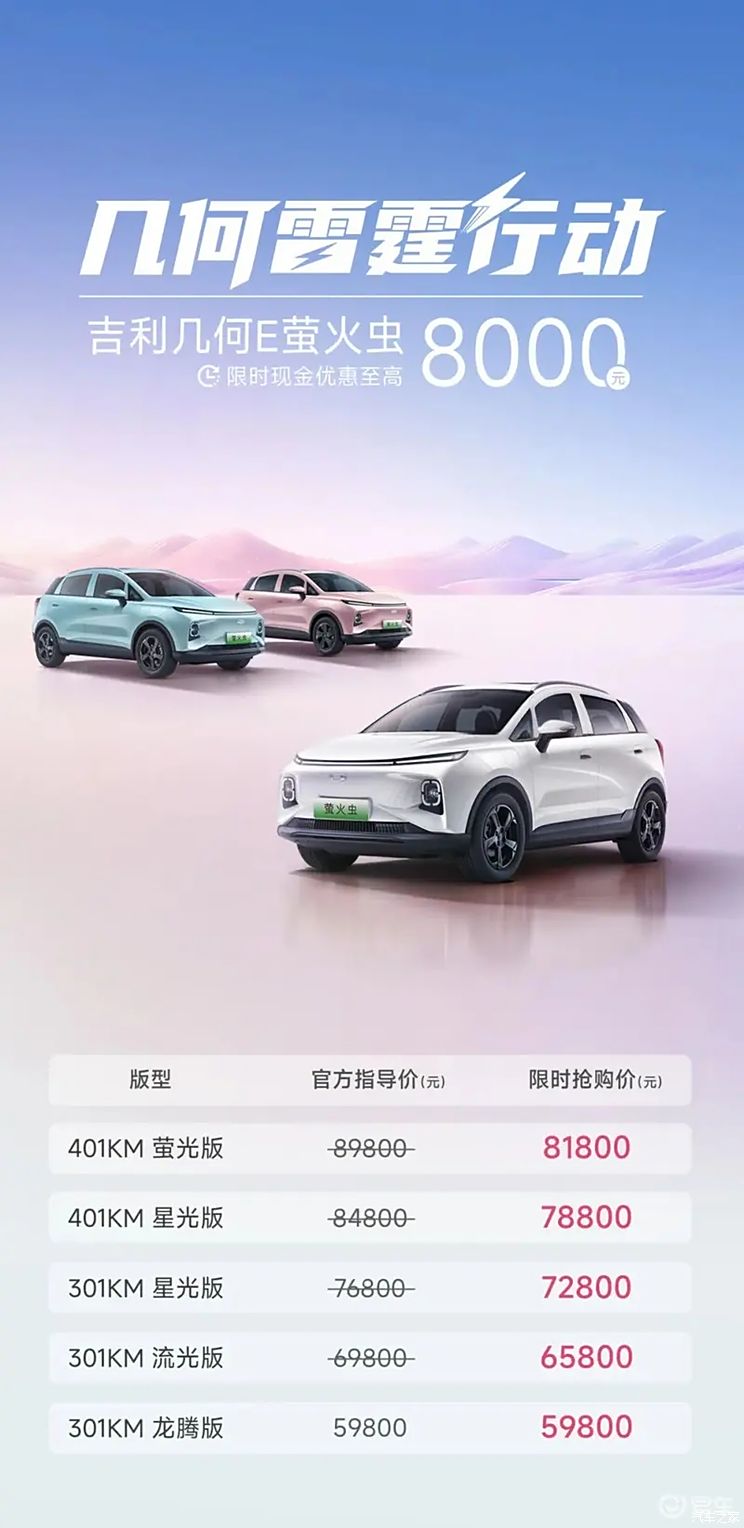 吉利汽车旗下几何E萤火虫车型近日推出了限时优惠活动。购车者在7月6日至31日期间购买该车,可享受最高8000元的现金优惠。此外,官方还提供了首任个人非营运车主三电终身质保、24期0首付以及年费率0.99%的先享后付等购车权益。