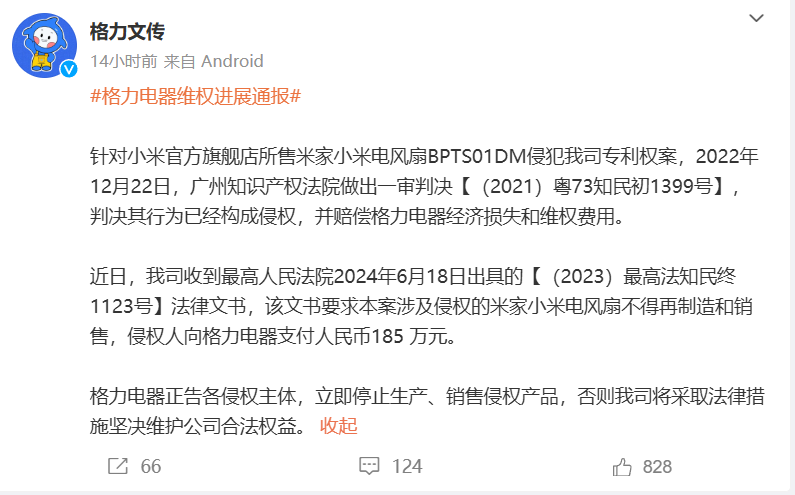 格力电器收到最高人民法院出具的法律文书,要求涉及侵权的米家小米电风扇不得再制造和销售,并向格力电器支付人民币185万元的赔偿费用。此次判决是针对小米官方旗舰店所售米家小米电风扇BPTS01DM侵犯了格力的专利权案。广州知识产权法院在2022年12月22日做出了这一判决。