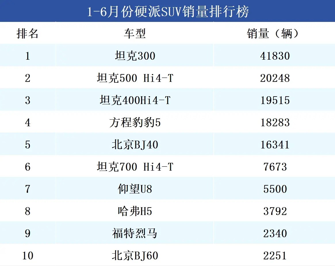 随着SUV市场的持续火爆,硬派SUV也逐渐成为了很多人的购车首选。虽然很多人并没有特别大的越野需求,但依然被硬派SUV霸气的外观所吸引。本文根据公开的销量数据盘点了今年上半年硬派SUV销量前十名,并推荐了其中几款备受欢迎的车型。