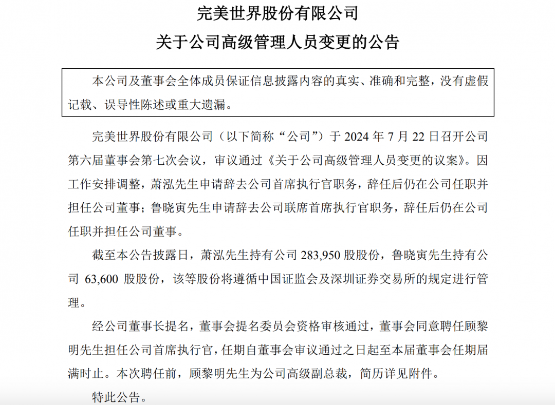 完美世界昨日发布公告,宣布首席执行官萧泓和联席首席执行官鲁晓寅同时提出辞去其职务。董事会已同意聘任顾黎明担任新的首席执行官,并在任职期间继续担任公司董事。