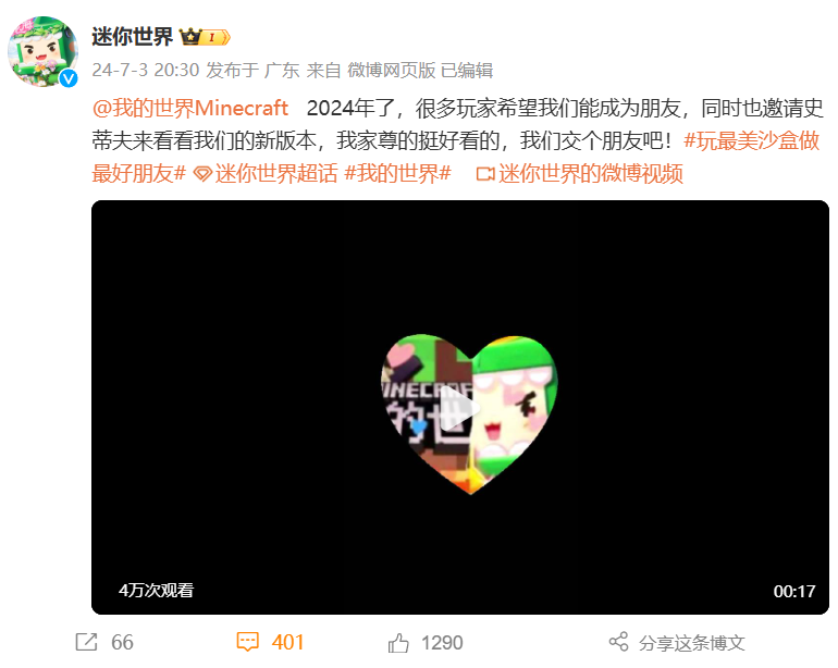 《迷你世界》游戏近日在社交媒体上发布消息,表达了与《我的世界》结为朋友的意愿。然而,目前尚未收到《我的世界》官方的回应。值得一提的是,该游戏的国内运营商网易曾于2022年11月向广东省高级人民法院提起著作权侵权及不正当竞争纠纷案件,指控《迷你世界》开发商深圳迷你玩公司在其游戏中使用了230个侵犯网易公司权益的元素,并要求赔偿5000万元人民币。该判决成为当时国内游戏侵权纠纷案件中判赔数额之最。