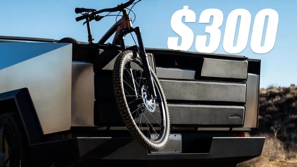 其次,特斯拉还推出了可拆卸座椅下方带有泡沫衬垫和Molle织带的尾门保护垫,售价300美元。这个保护垫缠绕在后挡板上并锁定到位,并且上面有一个漂亮的Cybertruck标志,是根据皮卡本身量身定制的。这种设计有助于保护那些想要与之对抗的装备,如山地车等。