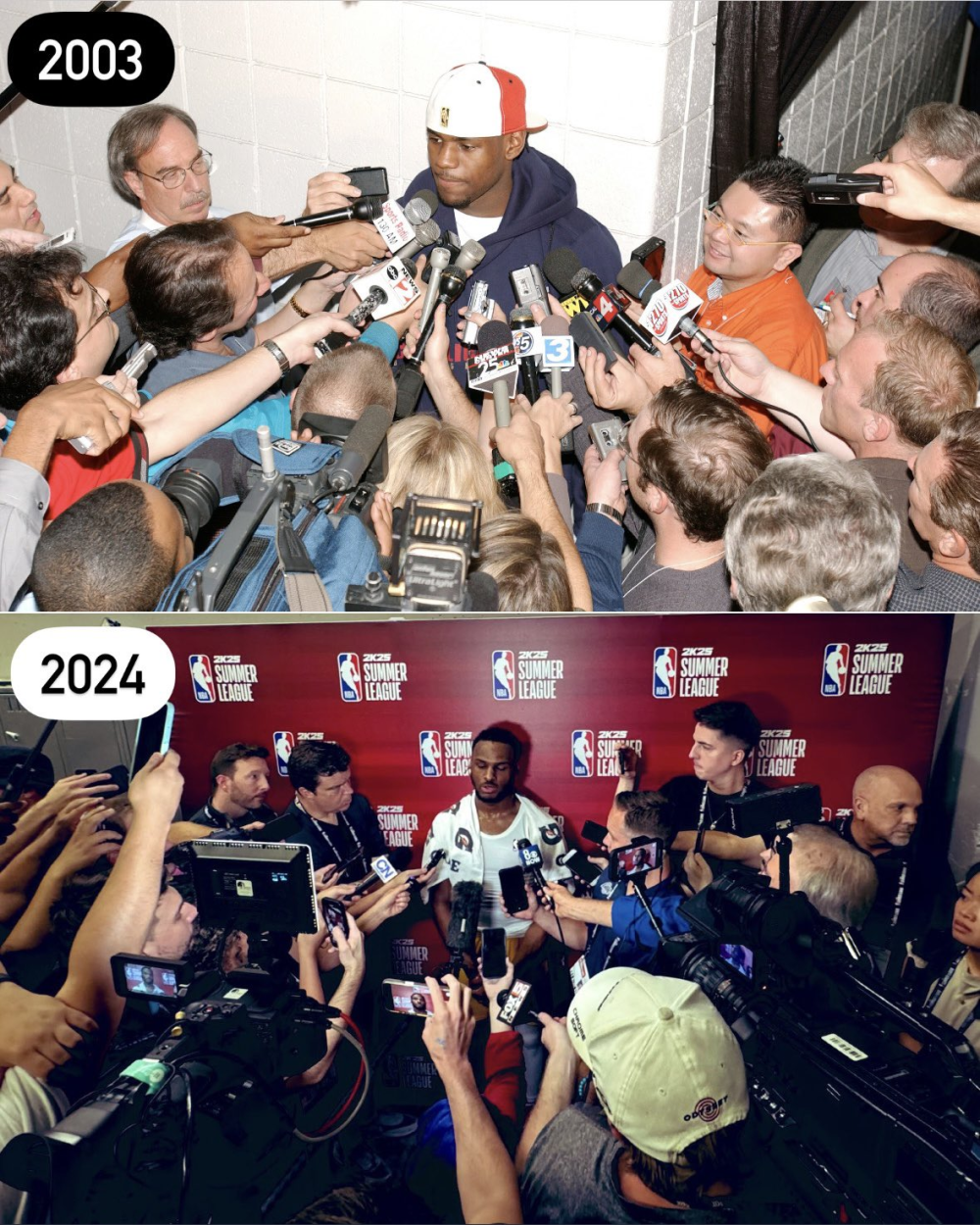 谈到自己想从夏联中收获什么时,布朗尼说道:“我每次登场都会变得更好,特别是和比我大的球员一起比赛时,我需要找到我擅长的角色。” 作为詹姆斯的大儿子,布朗尼的关注度很高,媒体晒出了詹姆斯新秀赛季的采访对比图,都是人山人海。