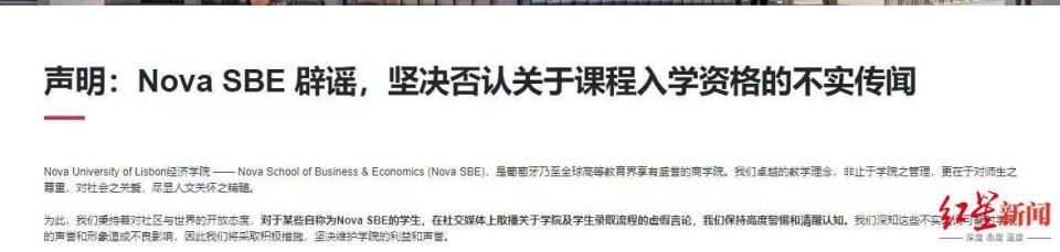 今年4月,Nova SBE在其官网上发布一份声明称,“对于某些自称为Nova SBE的学生,在社交媒体上散播关于学院及学生录取流程的虚假言论,我们保持高度警惕和清醒认知。我们深知这些不实之词可能对学院的声誉和形象造成不良影响,因此我们将采取积极措施,坚决维护学院的利益和声誉。”