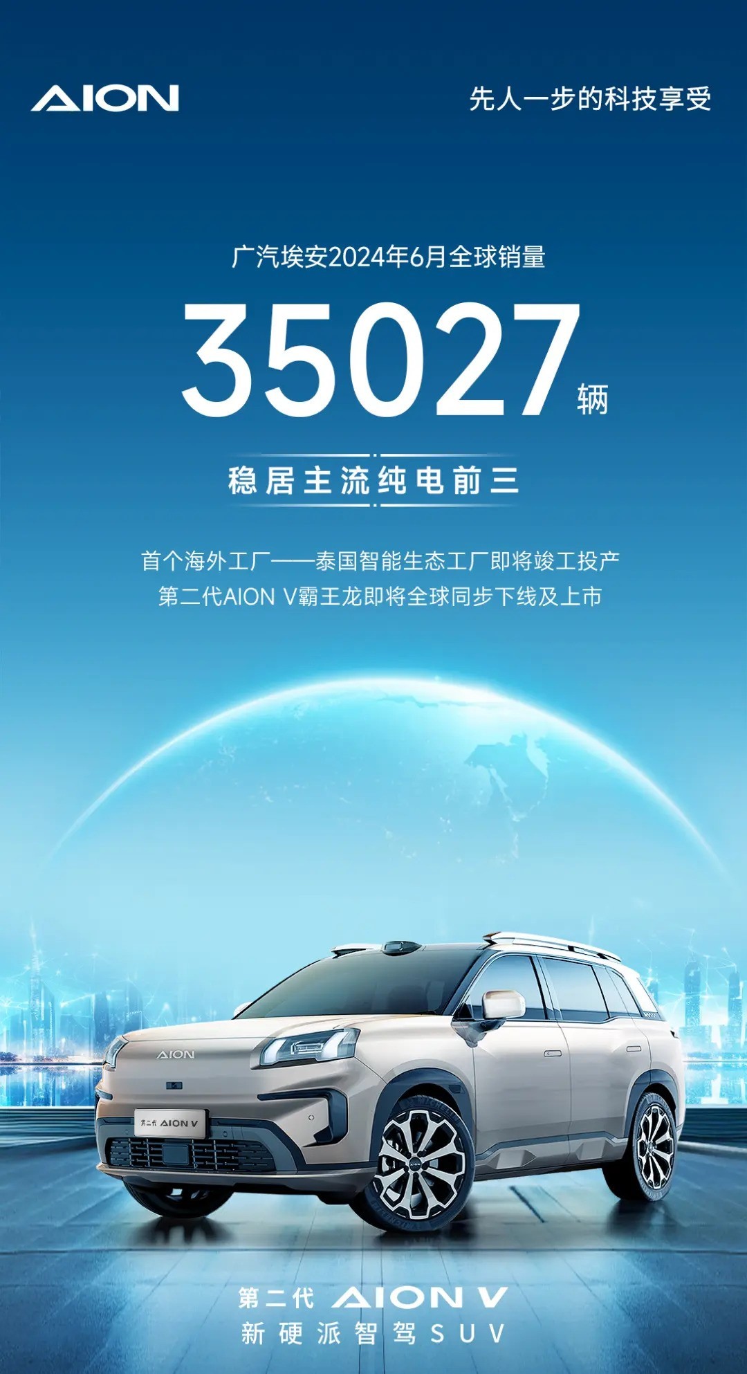 广汽埃安近日公布了其6月份的全球销量数据,共售出车辆35027辆。同时,该公司首个海外工厂——泰国智能生态工厂即将完工并投入运营。另外,第二代AION V(图片|配置|询价)“霸王龙”也将于全球范围内下线及上市。