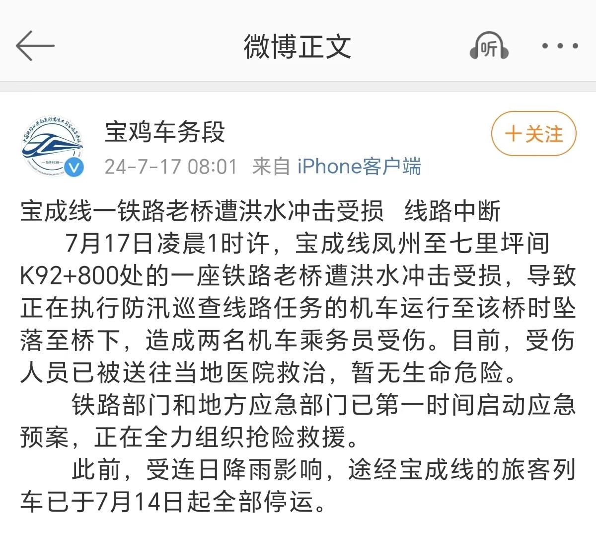 据宝鸡车务段微博客户端消息:7月17日凌晨1时许,宝成线凤州至七里坪间K92+800处的一座铁路老桥遭洪水冲击受损,导致正在执行防汛巡查线路任务的机车运行至该桥时坠落至桥下,造成两名机车乘务员受伤。