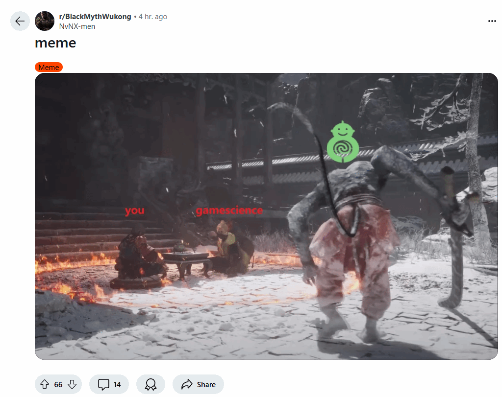 今日,游戏科学发布了《黑神话:悟空》的终极预告片。预告发布后不久,Reddit上的网友迅速制作了一张梗图,以视频结尾处“两人盘膝对饮,妖魔被挡在圈外”的场景为背景,戏谑地调侃了曾有传言称Sweet Baby试图勒索游戏公司700万美元的行为。图片中,玩家和游戏公司在雪地中对坐饮酒,而Sweet Baby则象征性地被描绘为无法进入的妖魔。评论区里玩家们纷纷表示这个梗图既快又妙,“做得好!”还有人认为这将成为新的梗图模板。