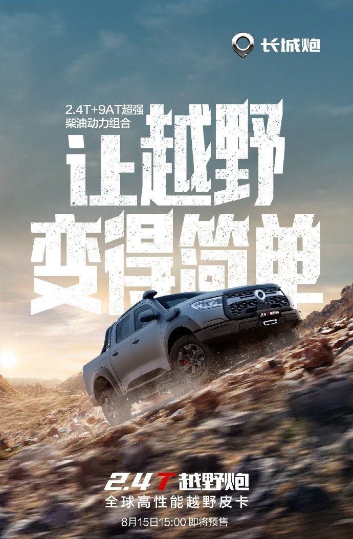 长城 2.4T 越野炮皮卡于8月15日正式预售,推出进阶版和高阶版两款车型,预售价分别为17.98万元和18.98万元。该车将于8月30日在成都车展期间上市。