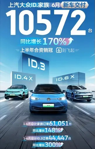 上汽大众ID.家族6月交付量达10572辆,同比增长170%。上半年累计订单61051辆,同比增长148%。其中,“大单品”ID.3表现最为突出,前6个月累计订单量同比增长300%。然而,ID.4 X和ID.6 X的销量并不尽如人意。