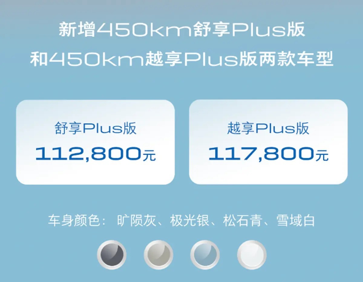 别克微蓝6新增车型舒享Plus和越享Plus版已经上市,售价分别为11.28万元和11.78万元。这些新车型的续航里程提升到了450km,并且配置也有所升级。外观造型没有变化,但新增了几种改色膜供选择。新车的长宽高分别为4650/1817/1519毫米,轴距为2660毫米,属于紧凑级轿车的级别。