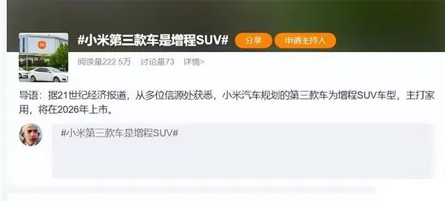 近日,据媒体报道称小米汽车的第三款车型确认为增程SUV。根据此前规划,小米汽车的首款车是纯电动轿车(小米SU7),第二辆车将是纯电动SUV。目前可以确认的是这款增程SUV将于2026年推出。