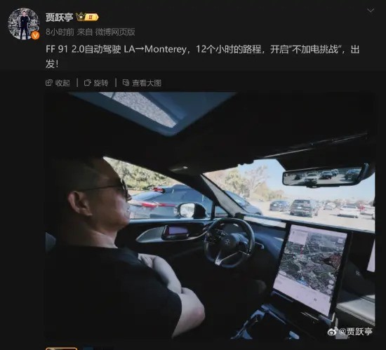 近日,贾跃亭在微博中分享了一张FF 91 2.0自动驾驶行驶的照片。从照片可以看出,车辆行驶的路线是从洛杉矶到蒙特雷,整个行程共计12个小时。贾跃亭还表示,在这次挑战中,FF 91并没有充电。