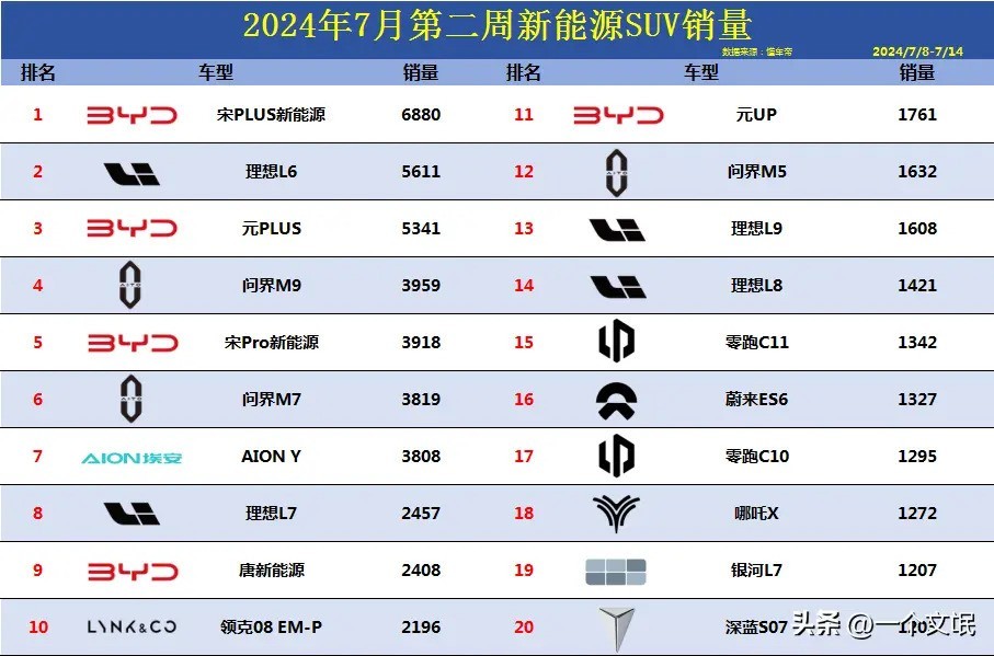 最新一周新能源SUV销量出炉,国产车型越发强势,合资车处境更加艰难。在新能源SUV销量排行中,宋PLUS、理想L6和元PLUS位列前三,问界M9、宋Pro新能源和领克08也进入了前五名。其中,理想L6的销量出乎意料地高。