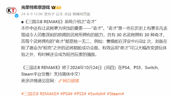 《三国志8 REMAKE》将于10月24日登陆Steam、PS5、PS4和Switch平台,并支持简体中文。玩家们可以通过关注该作的专区获取更多相关资讯。