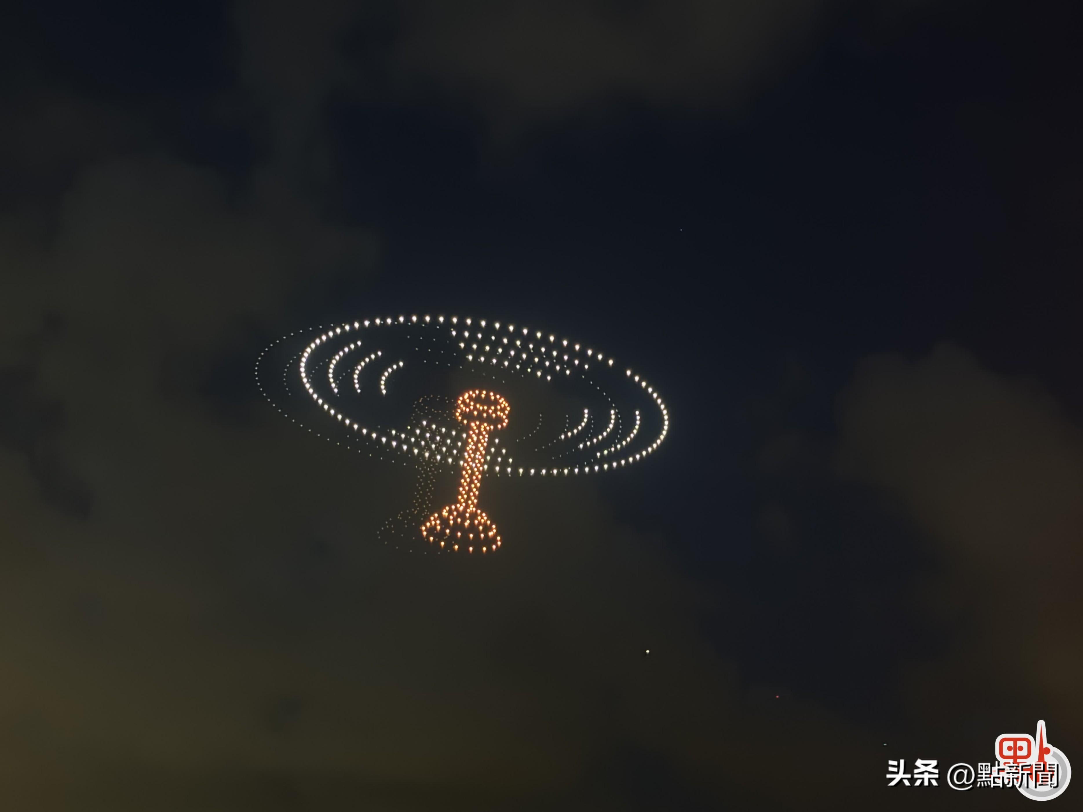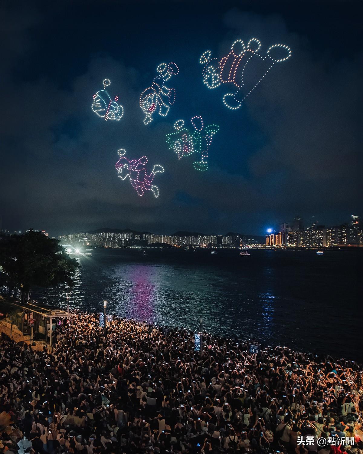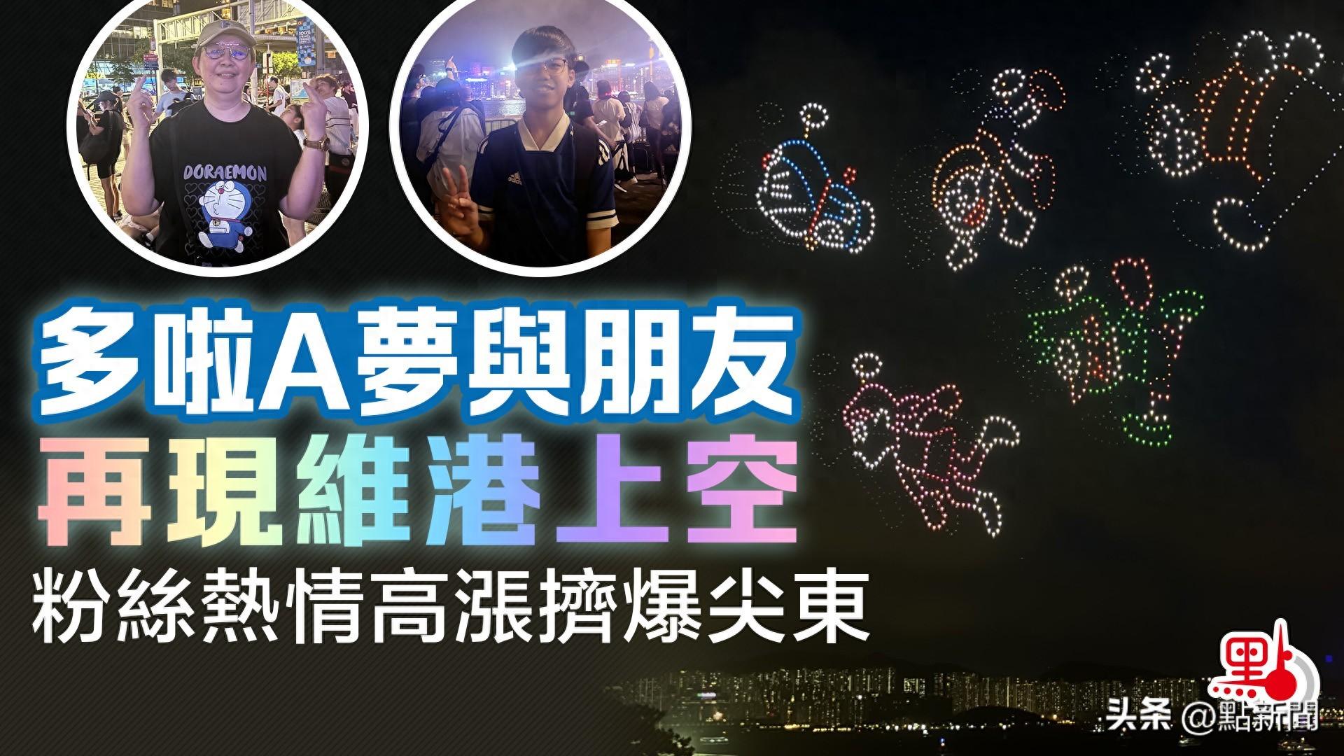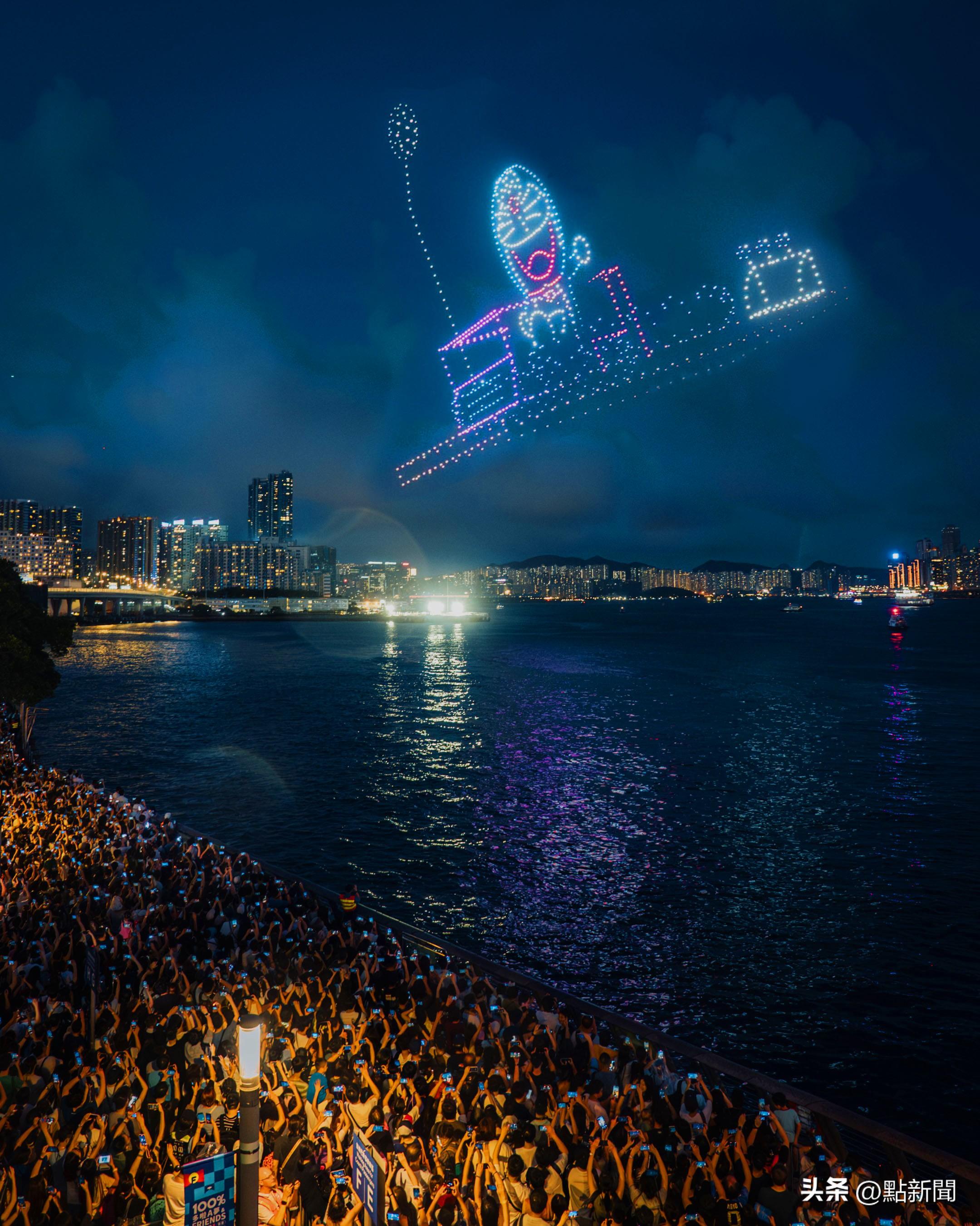 晚上7时30分,一千架无人机升至维港上空,汇集成多啦A梦乘坐时光机,穿越时光而来。