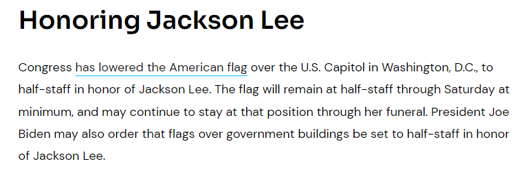 CHRON报道称,为了纪念杰克逊·李,国会已将位于华盛顿特区的国会大厦上空的美国国旗降半旗。国旗将至少在周六(7月27日)之前保持半旗的状态,并可能在她的葬礼期间继续保持在该位置。拜登还可能下令将政府大楼上空的旗帜设置为半旗。
