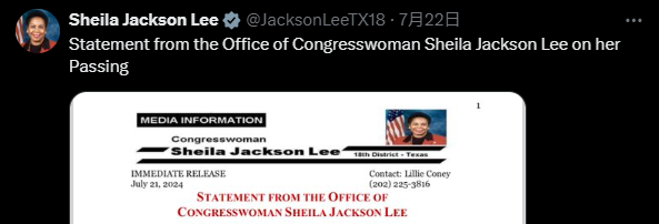 据了解,杰克逊·李来自得州第18选区,是众议院民主党首席副党鞭,在国会中担任多个小组委员会的重要职务。6月时,杰克逊·李确诊了胰腺癌。上周五晚间,杰克逊·李的团队宣布了她的逝世消息。