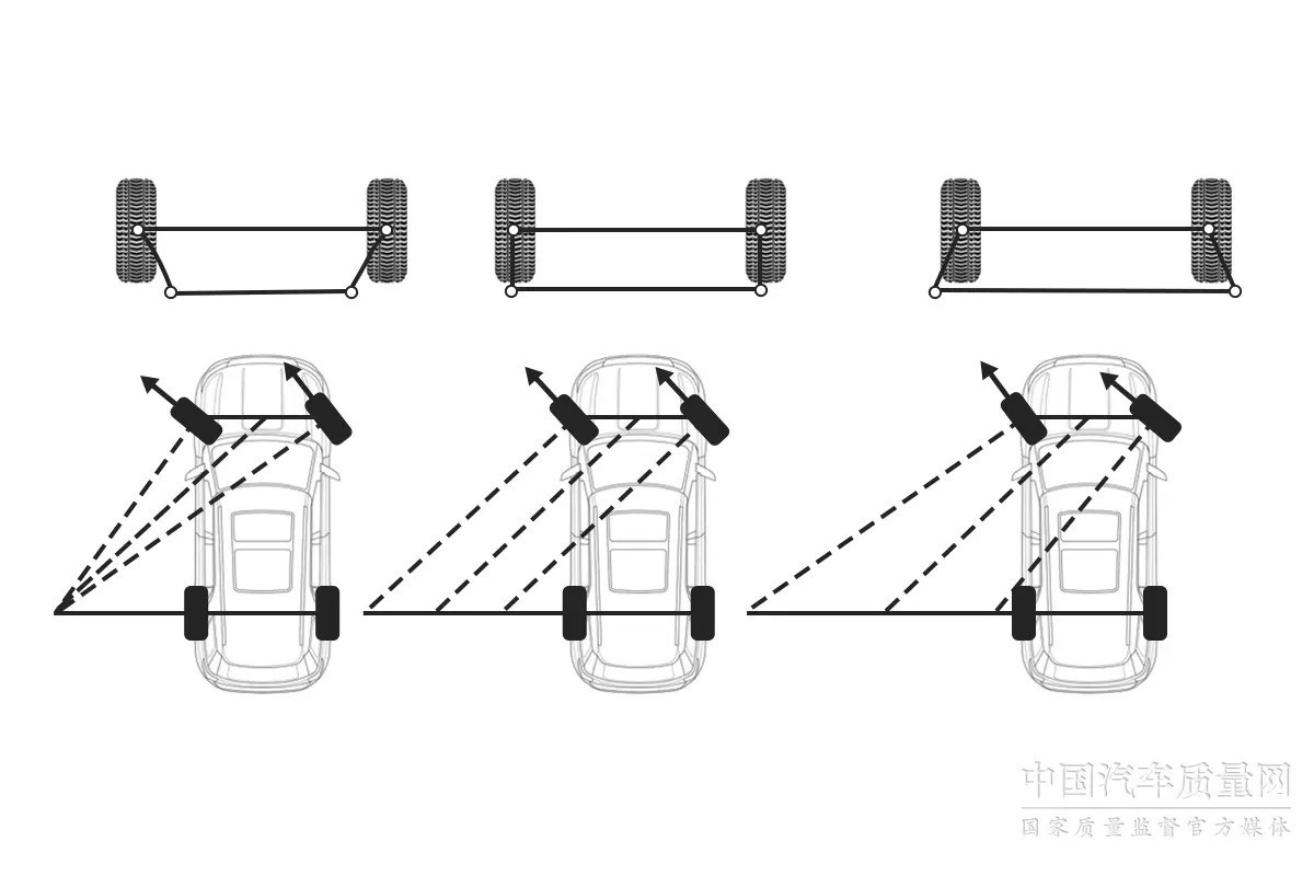 目前主流车辆普遍采用转向梯形来满足阿克曼角条件。在这个平面四杆机构中,如果转向横拉杆作为短边且位于轮轴后方,则可以使内侧车轮的转动速率更快。反之,如果转向横拉杆变为长边,则需要在轮轴之前实现相同效果,以使两个导向轮变化夹角的曲线更加趋近于阿克曼角曲线。