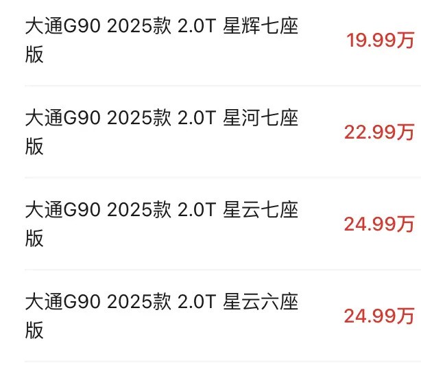 2025款大通G90正式上市,售价区间19.99万-24.99万元。此次改款的车型定位为中大型MPV,起售价与老款车型保持一致,并对配置进行了调整。入门版的星辉7座版增加了零重力座椅、第二排座椅电动调节/腿托等配置,但减少了车道偏离预警、前方碰撞预警、倒车车侧预警、主动刹车、并线辅助、车道保持辅助系统、全速自适应巡航等功能。