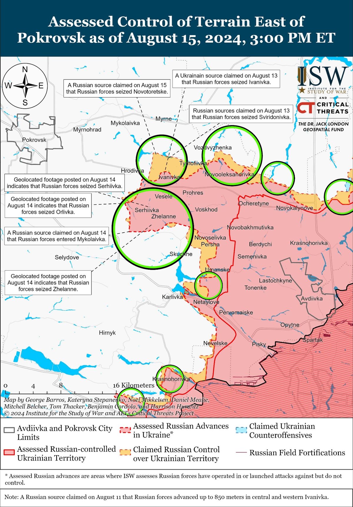 8 月 14 日、 15 日发布的地理定位视频显示,俄军正在波克罗夫斯克以东的赫罗迪夫卡(Hrodivka),波克罗夫斯克东南部的尼古拉耶夫卡(Mykolaivka)、热拉内(Zhelanne)和奥尔利夫卡(Orlivka)推进。“战争研究所”评估,俄军可能已经占领了热拉内、奥尔利夫卡这两个村子。