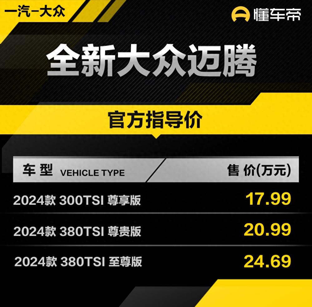 [懂车帝原创 产品] 7月9日,一汽-大众全新一代迈腾(B9)正式上市,共推出3款车型,指导价格区间为17.99万-24.69万元。作为换代产品,全新迈腾对外观及内饰进行重新设计,搭载大众与大疆联合开发的IQ. Pilot智能驾驶辅助系统,提供1.5T发动机和2.0T高功率发动机可选。