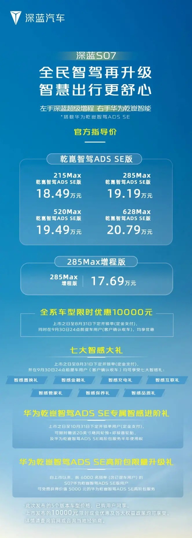 深蓝汽车今日对 S07车型的官方指导价进行了调整,主要涉及华为乾崑智驾 ADS SE 版。其中,215Max 乾崑智驾 ADS SE 增程版的调整为18.49万元,降幅为5000元;285Max 乾崑智驾 ADS SE 增程版的调整为19.19万元,降幅为8000元;520Max 乾崑智驾 ADS SE 纯电版的调整为19.49万元,降幅也为5000元;628Max 乾崑智驾 ADS SE 纯电版的调整为20.79万元,降幅也是5000元。此外,285Max增程版的调整为17.69万元,原指导价为17.99万元,降幅3000元。