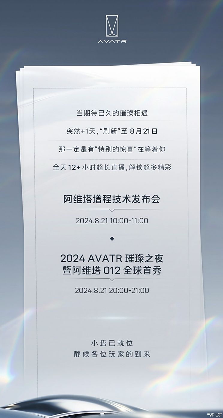 阿维塔官方宣布,将于8月21日举办增程技术发布会,届时将有多款车型推出增程版本。其中,全球联名限量版车型――阿维塔012也将在同一天进行全球首秀。