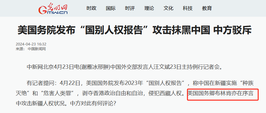中国新闻网《美国务院发布“国别人权报告”攻击抹黑中国 中方驳斥》