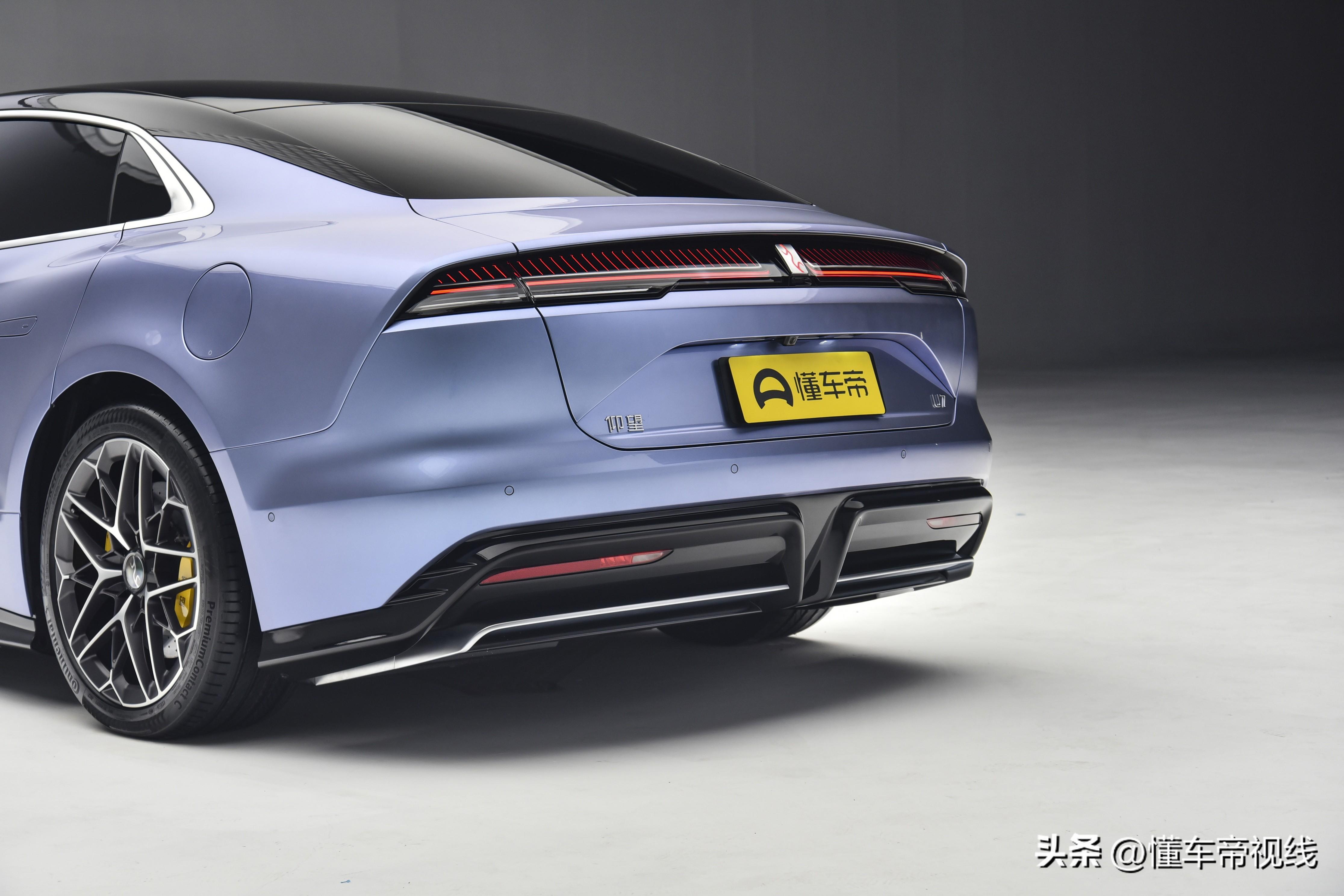 仰望U7采用了溜背设计,前翼子板处装饰件延伸至前门,配合其他多处空气动力学设计。官方表示当车速为120公里/小时的情况下,仰望U7的风阻系数仅为0.195。该车配备了前后相同规格的轮辋,提供两种轮辋造型可选,尺寸为275/40 R21,还配备了比亚迪自研自产的碳陶瓷刹车盘,刹车卡钳也采用了亮黄色涂装。