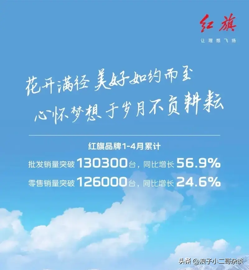 先看数据:一汽红旗今年1-4月零售销量累计突破126000辆,同比增长24.6%;今年前4个月一汽红旗批发销量突破130300辆,同比增长56.9%。