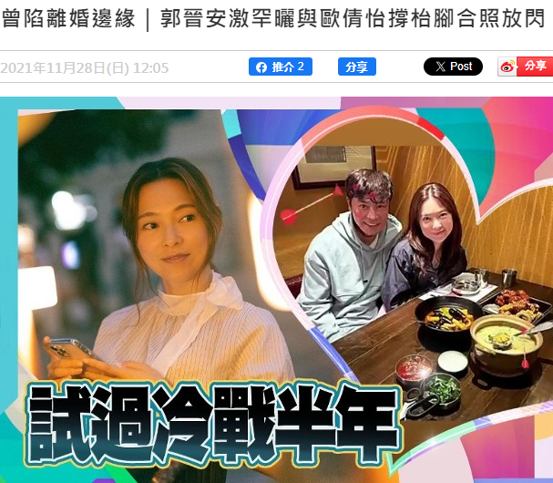 5月2日,59岁的郭晋安突然宣布离婚,表示两年前就和欧倩怡分居了。