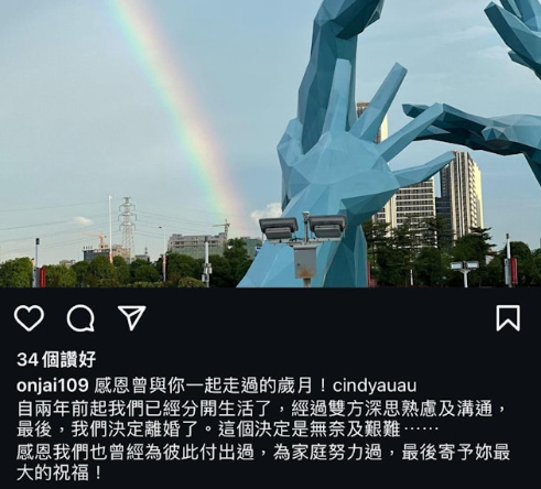 欧倩怡和郭晋安在社交平台发文宣布离婚:“感恩曾与你一起走过一段美好的岁月!自两年前起我们已经分开生活了,而作出离婚这个决定是经过我俩的深思熟虑及沟通。决定是无奈及艰难??感恩我们也为彼此付出过,为家庭努力过……给予彼此最大祝福。”