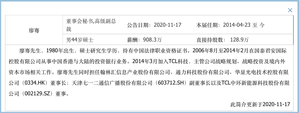 公开信息显示,廖骞出生于1980年,2006年8月至2014年2月在国泰君安国际控股有限公司从事中国香港与大陆的投资银行业务。2014年3月加入TCL科技,主管公司战略规划、战略投资及境内外资本市场相关工作。目前的职务除了董秘外还是TCL科技的高级副总裁,并且其持股公司128.9万股。另外,廖骞同时还担任翰林汇(835281.NQ)、通力科技股份有限公司、华显光电技术控股有限公司(0334.HK)董事长;七一二(603712.SH)副董事长以及TCL中环(002129.SZ)董事。需要指出是,2022年廖骞的薪酬为565.34万元。