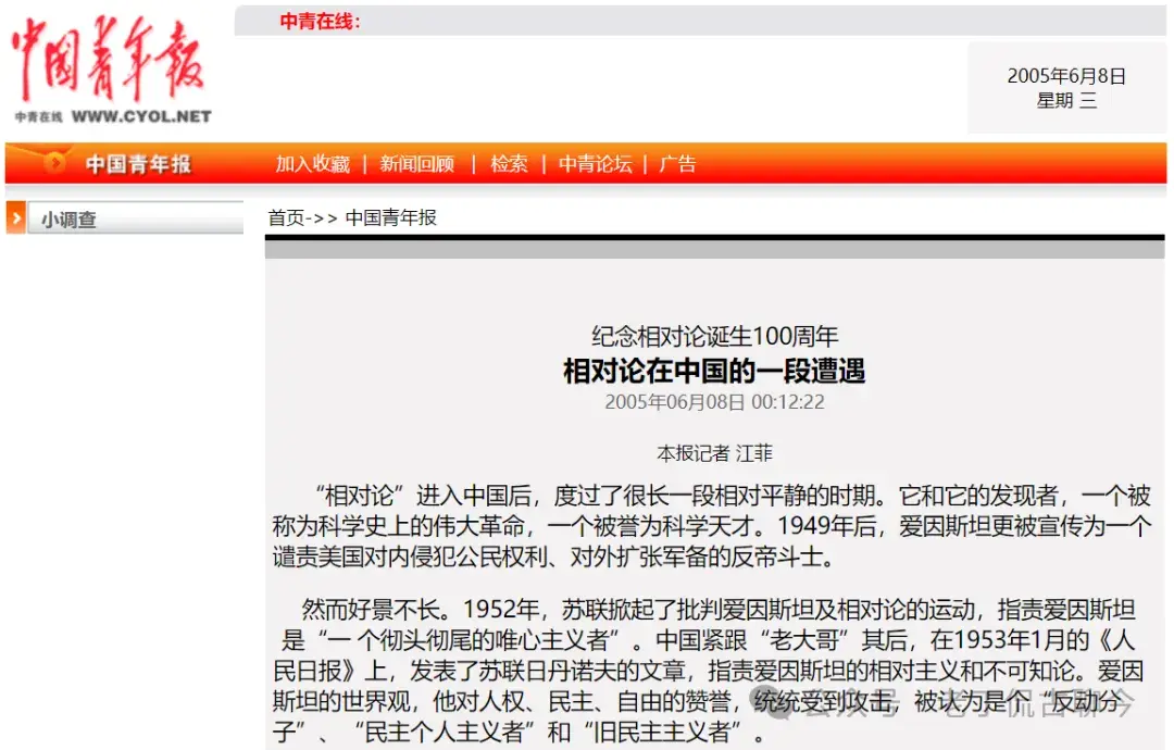 2005年6月8日,《中国青年报》曾刊发过一篇题为《纪念相对论诞生100周年相对论在中国的一段遭遇》的文章。若您想对那段历史有进一步的了解,不妨去读一读这篇文章,老丁在此不做赘述。