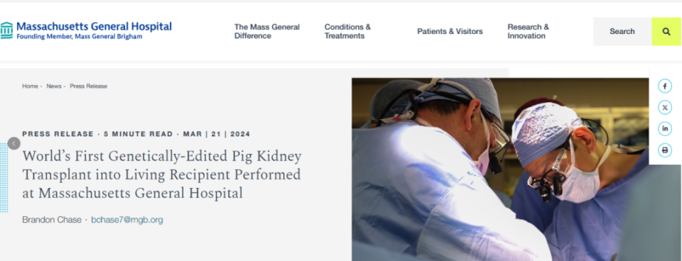 据央视新闻,美国马萨诸塞综合医院3月21日发布消息称,该院医学专家已成功为一名美国男性终末期肾病患者进行了一项特殊的移植手术,将经基因编辑的猪肾脏移植入其体内。这是全球首例。这名男子术后恢复良好。