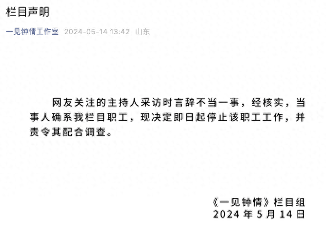 近日,“情侣拒绝采访被主持人劝分手”引发关注,有网友指出该街采记者疑为青岛广播电视台主持人。5月14日,青岛电视台《一见钟情》栏目发布声明:网友关注的主持人采访时言辞不当一事,经核实,当事人确实系我栏目职工,现决定即日起停止该职工工作,并责令其配合调查。