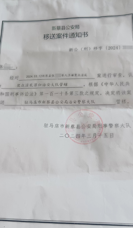 红星新闻获取的一份新蔡县公安局移送案件通知书显示,3月15日,新蔡县公安局刑警大队通知张女士,经对3月12日张某等人涉嫌聚众淫乱案进行审查,认为聚众淫乱罪归治安大队管辖,根据《中华人民共和国刑事诉讼法》第一百一十条第三款之规定,决定将该案移送驻马店市新蔡县公安局治安警察大队管辖。