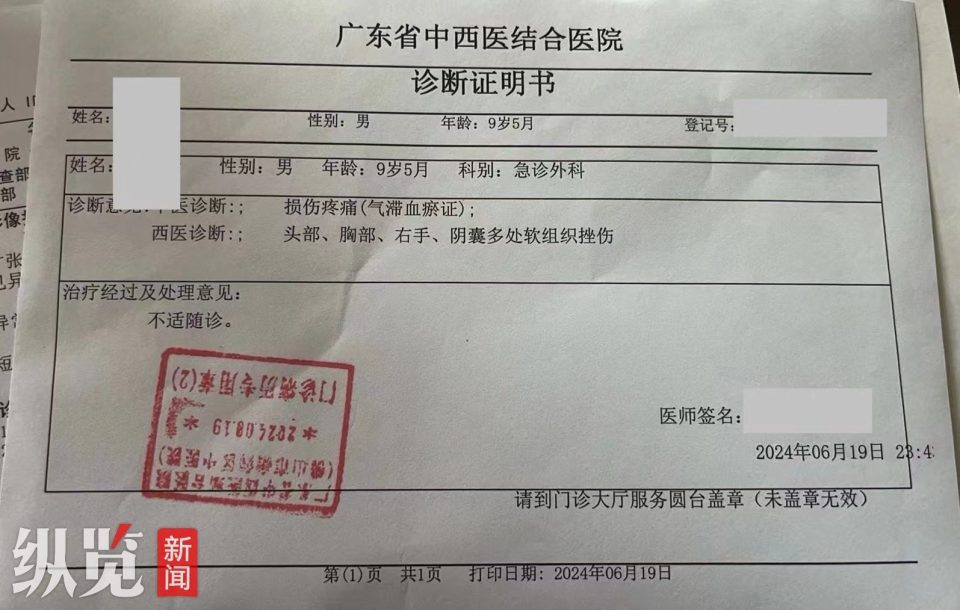 刘女士向记者出示的报警回执显示报警时间为6月17日21时21分,接警部门为肇庆市古塔派出所。此后,刘女士带着星星来到广东省中西医结合医院进行了检查。根据该医院6月19日出具的诊断证明书显示,星星的头部、胸部、右手、阴囊多处软组织挫伤。随后,刘女士将诊断结果提供给了肇庆市古塔派出所,在古塔派出所民警的协助下,刘女士查看了和融机构的监控视频。