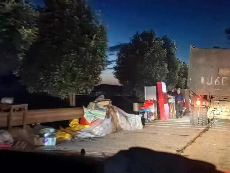 6日凌晨5时,在团西村附近的s202道路旁,收到撤离通知后,当地村民趁着水没来,用三轮车、摩托车等连夜往外搬运冰箱等大件物品撤离。