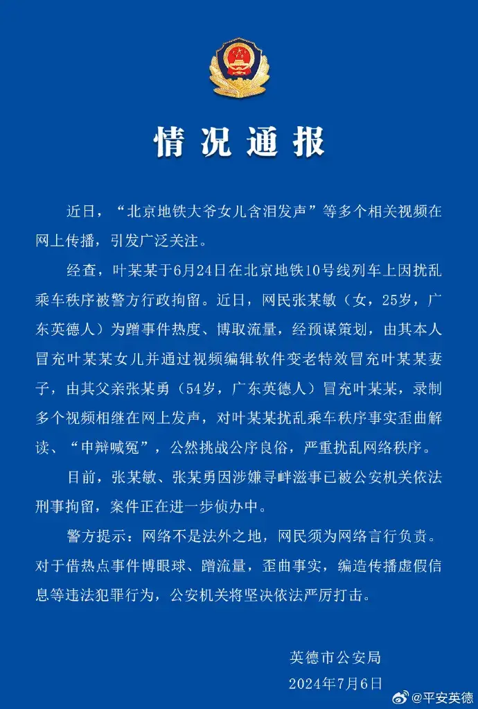 经查,叶某某于6月24日在北京地铁10号线列车上因扰乱乘车秩序被警方行政拘留。近日,网民张某敏(女,25岁,广东英德人)为蹭事件热度、博取流量,经预谋策划,由其本人冒充叶某某女儿并通过视频编辑软件变老特效冒充叶某某妻子,由其父亲张某勇(54岁,广东英德人)冒充叶某某,录制多个视频相继在网上发声,对叶某某扰乱乘车秩序事实歪曲解读、“申辩喊冤”,公然挑战公序良俗,严重扰乱网络秩序。