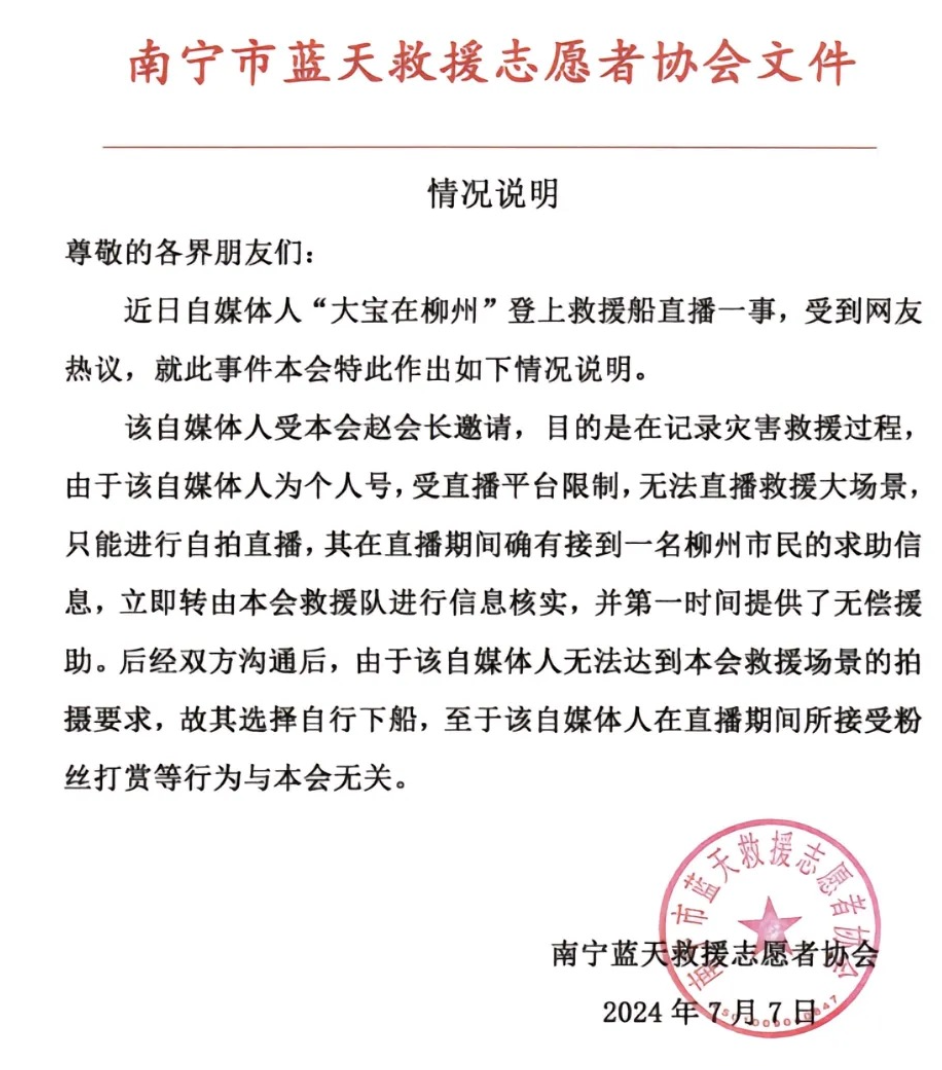 转载:https://new.qq.com/rain/a/20240709A0408800 2024-07-09 12:49·界面新闻·发布于山西 近日,南宁蓝天救援队在广西柳州开展救援工作时,一名柳州的网红登上救援艇进行直播并接受打赏。对此,南宁蓝天救援志愿者协会发布情况说明指出,由于该自媒体人无法达到协会救援场景的拍摄要求,故其选择自行下船,至于该自媒体人在直播期间所接受粉丝打赏等行为与协会无关。此前报道广西一女网红在蓝天救援队救助时艇上开直播接受打赏?双方回应