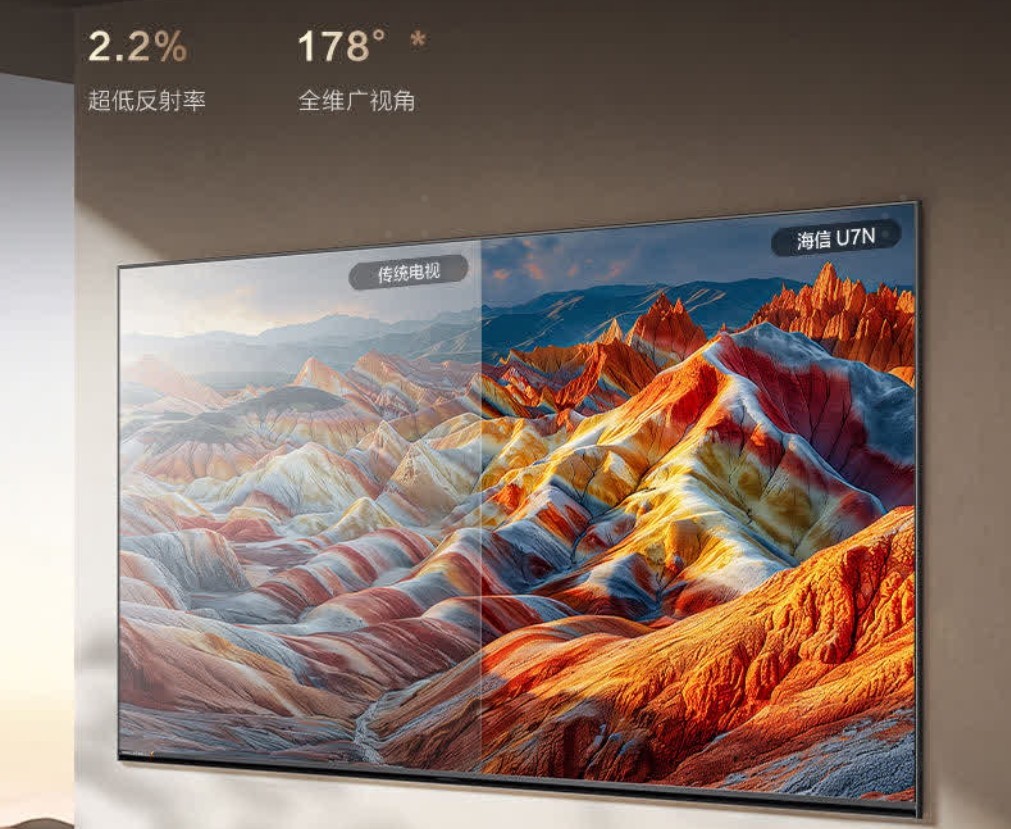 屏幕是电视画质呈现的直接载体,海信电视U7N系列搭载的黑曜屏,拥有2.2%超低反射率、178°全维广视角,无惧强光干扰,带来深邃黑不反光的效果,正看侧看都是C位,无论是观影、追剧、看比赛,还是打游戏,沉浸感都爆棚。