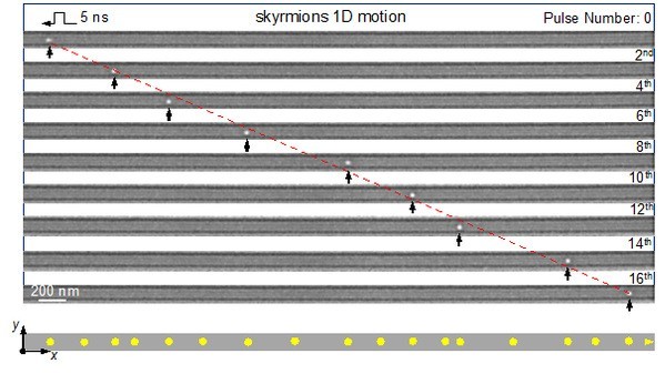 通过控制电流脉冲宽度及电流密度,在赛道边界的边缘态磁结构上稳定了磁斯格明子运动。这使得他们能够实现单个80nm大小的磁斯格明子在100nmFeGe赛道中进行一维、稳定而高速运动。