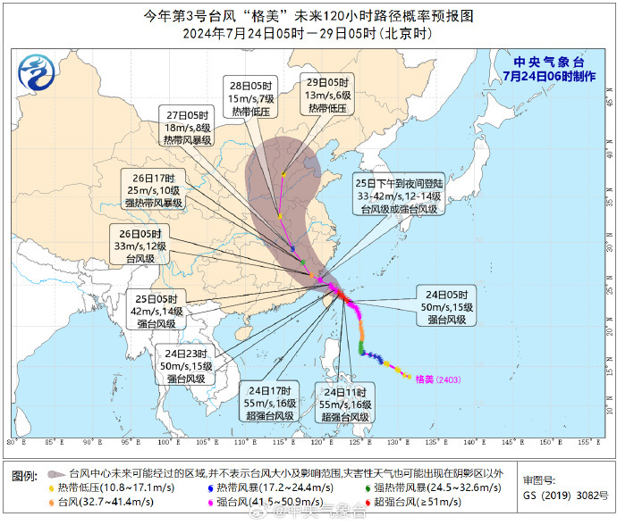预计,“格美”将以每小时20公里左右的速度向北偏西转西北方向移动,强度继续加强,最强可达超强台风级(16~17级,52~58米/秒),逐渐向台湾东部沿海靠近,将于24日晚上在台湾中北部沿海登陆(强台风级,14~15级,45~50米/秒)。之后穿过台湾,将于25日下午到夜间在福建福鼎到晋江一带沿海登陆(台风级或强台风级,12~14级,33~42米/秒)。