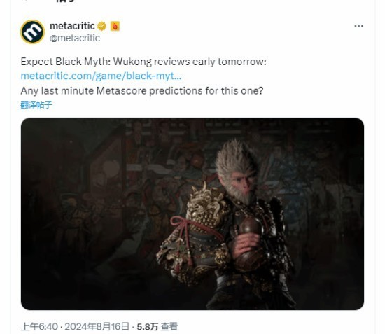 《黑神话:悟空》的媒体评价将于今晚揭晓。最近,游戏评论站点发布了一项预热活动,邀请玩家参与对这款游戏的评分预测。