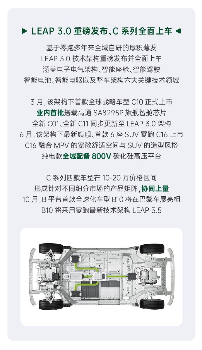 零跑汽车近日公布了其后续产品规划。今年内,公司将在推出C10、C16等基于LEAP 3.0技术架构的产品之后,于10月在巴黎车展期间亮相B10这款基于零跑最新技术架构LEAP 3.5打造的全球化车型。