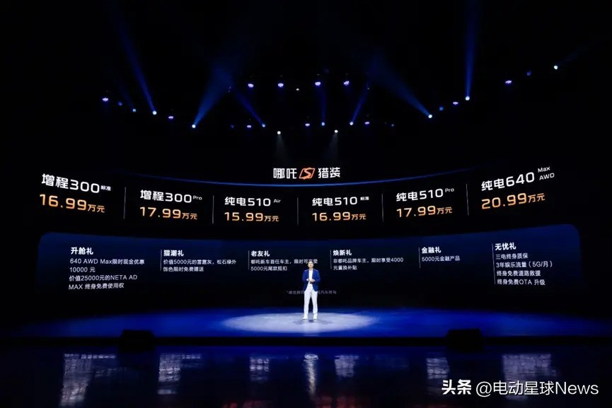其中,增程版有两款车型可选:16.99万元的增程300标准版和17.99万元的增程300Pro版。而纯电版则推出四个版本:分别是售价15.99万元的510Air版、16.99万元的纯电510标准版、17.99万元的纯电510Pro版以及20.99万元的640AWDMax版。